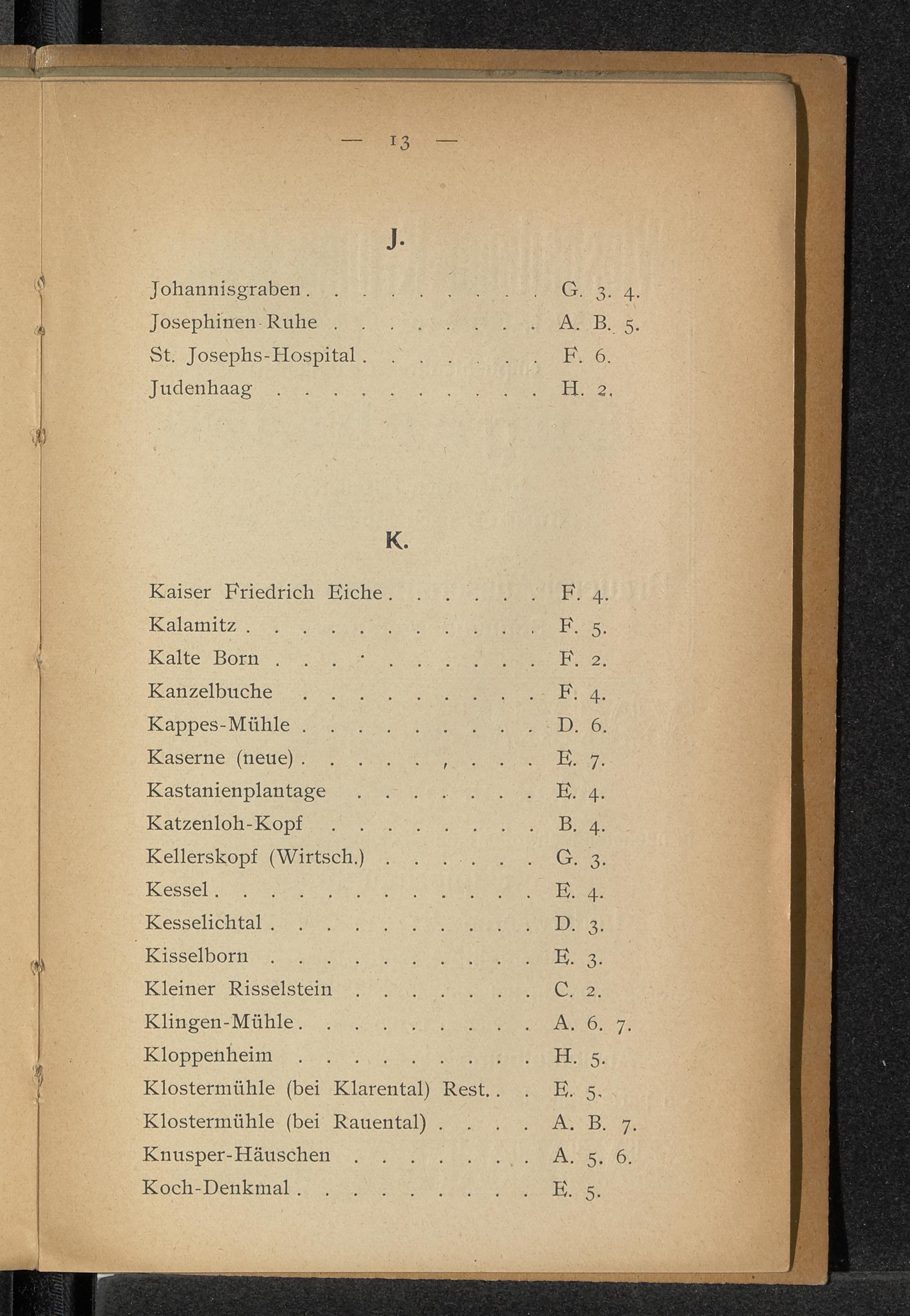 Verzeichnis der Namen auf der Karte der Umgebung von Wiesbaden.